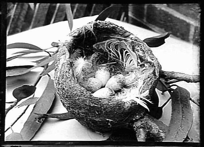 Strong deep cup/bowl nest lined with feathers containing 4 eggs.