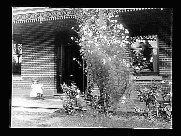 Front veranda of a house, with a large flowering plant in the garden.