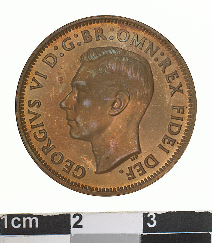 Bare head of George VI facing left; around, GEORGIVS VI D: G: BR: OMN: REX FIDEI DEF. ; below the head in small lettering the artist's initials HP.