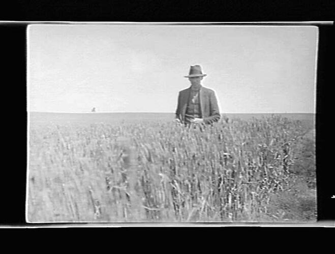 Black and white photographic negative by the photographer William (Bill) Boyd. The Bill Boyd Photographic Collection consists of 446 negatives on film and 56 photographs on paper depicting farming activities, family and the domestic life of people who settled the challenging wheat frontier of the Mallee, mainly in and around the towns of Nandaly & Sea Lake. The images were captured to highlight the vanishing pioneer atmosphere and to record agriculture techniques used during the 1920s. For detailed description of Boyd's life and work, see "Having a Go - Bill Boyd's Mallee" by Weston Bate, published in 1988. Most of the photographs were taken between 1920 & 1928. See separate records for detailed description of each negative. Descriptive data has been transcribed from interview with Bill Boyd in 1988.