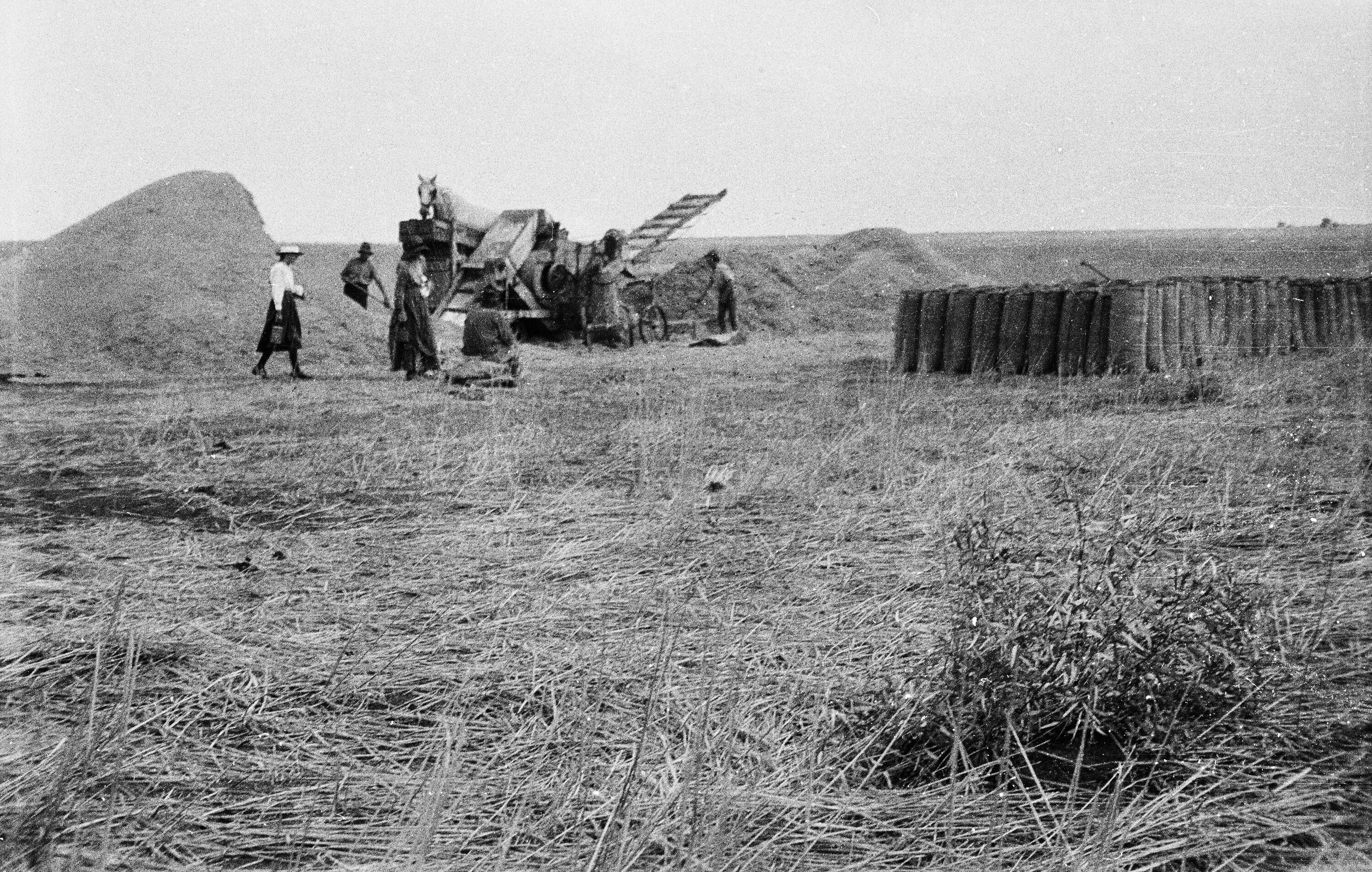 Black and white photographic negative of farmers threshing, winnowing and bagging crops with Rupert Stewart's harvester on a farm in Bimbourie, near Nandaly, Victoria. At right is a 300 bag 'heap' with half of the 'heap' still to clean [shown at left]. Mrs. Boyd and Mary are bringing the afternoon tea.