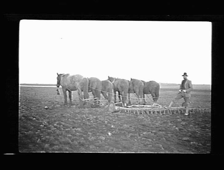 Black and white photographic negative by the photographer William (Bill) Boyd. The Bill Boyd Photographic Collection consists of 446 negatives on film and 56 photographs on paper depicting farming activities, family and the domestic life of people who settled the challenging wheat frontier of the Mallee, mainly in and around the towns of Nandaly & Sea Lake. The images were captured to highlight the vanishing pioneer atmosphere and to record agriculture techniques used during the 1920s. For detailed description of Boyd's life and work, see "Having a Go - Bill Boyd's Mallee" by Weston Bate, published in 1988. Most of the photographs were taken between 1920 & 1928. See separate records for detailed description of each negative. Descriptive data has been transcribed from interview with Bill Boyd in 1988.