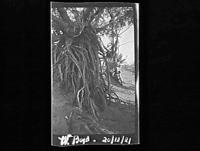Black and white photographic negative by the photographer William (Bill) Boyd. The Bill Boyd Photographic Collection consists of 446 negatives on film and 56 photographs on paper depicting farming activities, family and the domestic life of people who settled the challenging wheat frontier of the Mallee, mainly in and around the towns of Nandaly & Sea Lake. The images were captured to highlight the vanishing pioneer atmosphere and to record agriculture techniques used during the 1920s. For detailed description of Boyd's life and work, see "Having a Go - Bill Boyd's Mallee" by Weston Bate, published in 1988. Most of the photographs were taken between 1920 & 1928. See separate records for detailed description of each negative. Descriptive data has been transcribed from interview with Bill Boyd in 1988.