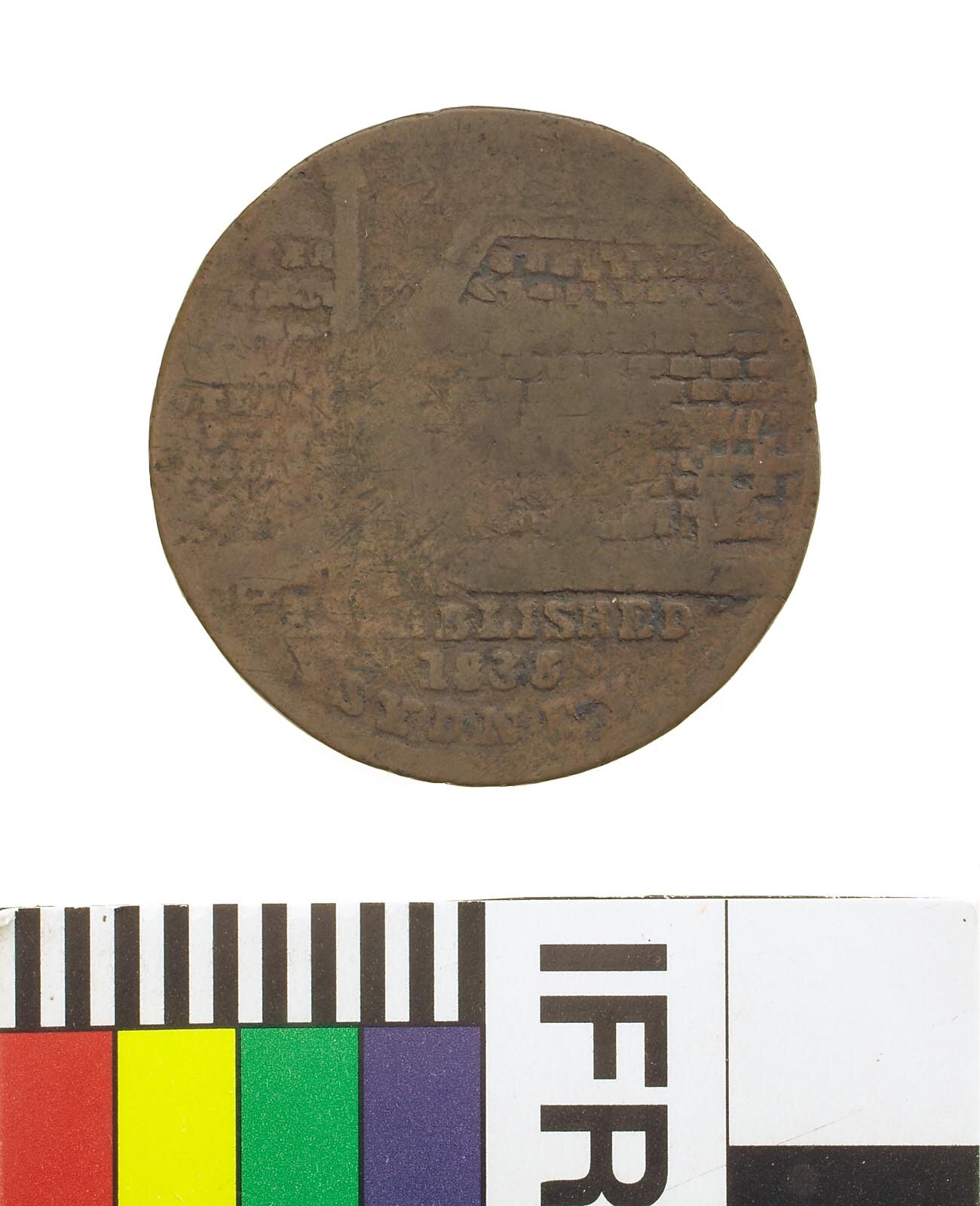 A round copper token (29 mm diameter). The token design featuring the business and foundation date of the issuer: Tea Stores Steam Coffee Mill. It features a view of teas store and shop; on building at left background in five lines; TEA / STORE / STEAM / COFFEE / MILLS in exergue, ESTABLISHED / 1835 / SYDNEY. The side wall of the building has had a second series of 'bricks' added suggesting perspective - difficult to see due to wear on this example. On the reverse is Britannia seated facing right wearing Corinthian helmet and holding a trident in her left hand, shield with Union Jack resting behind. Above, BRITANNIA; in exergue, 1852 and, in small letters below shield, JCT.