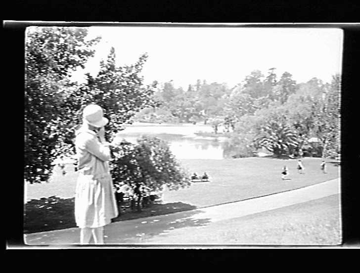 Woman standing on pathway in the Royal Melbourne Botanical Gardens ducks on grass. Also see coll. No.315.