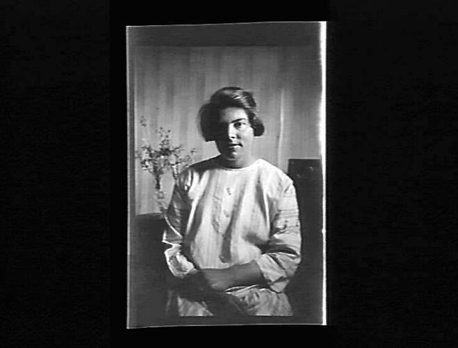 Portrait of a seated woman. Vase of flowers in background.