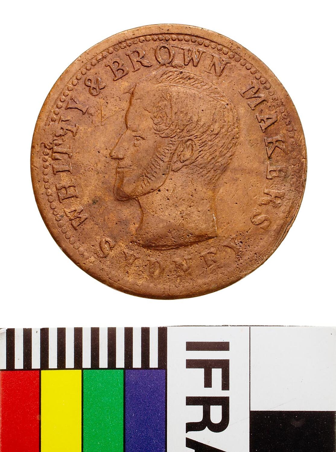 Head of man facing to left (some die deterioration in field from forehead head has been re-engraved on die); around, WHITTY & BROWN MAKERS; below, SYDNEY