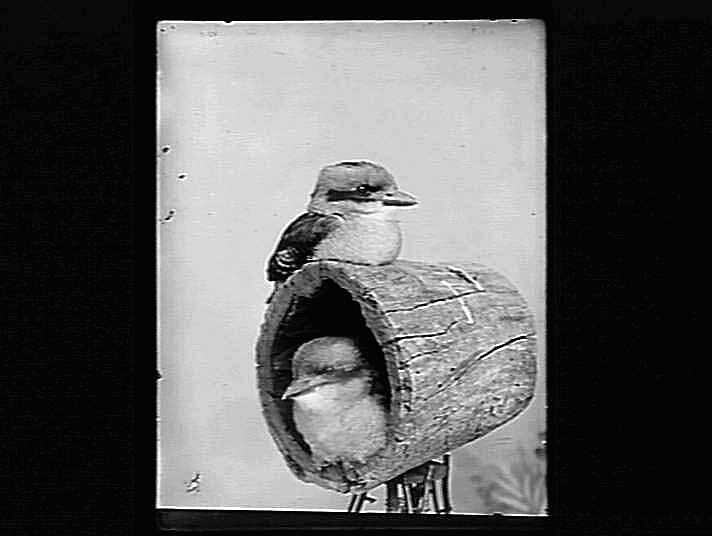 Two kookaburra nestlings.. One is in a hollow log while the other perches above it.