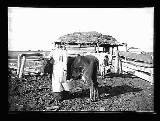 The caption 'Milking Maid' is taken from a print of the same photograph, MM 70185, Photograph - 'Milking Maid', by A.J. Campbell, Echuca, Victoria, circa 1895.