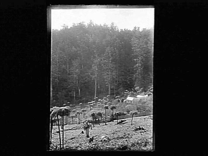 Remnant treeferns on a farm , massive trees in forest to rear.