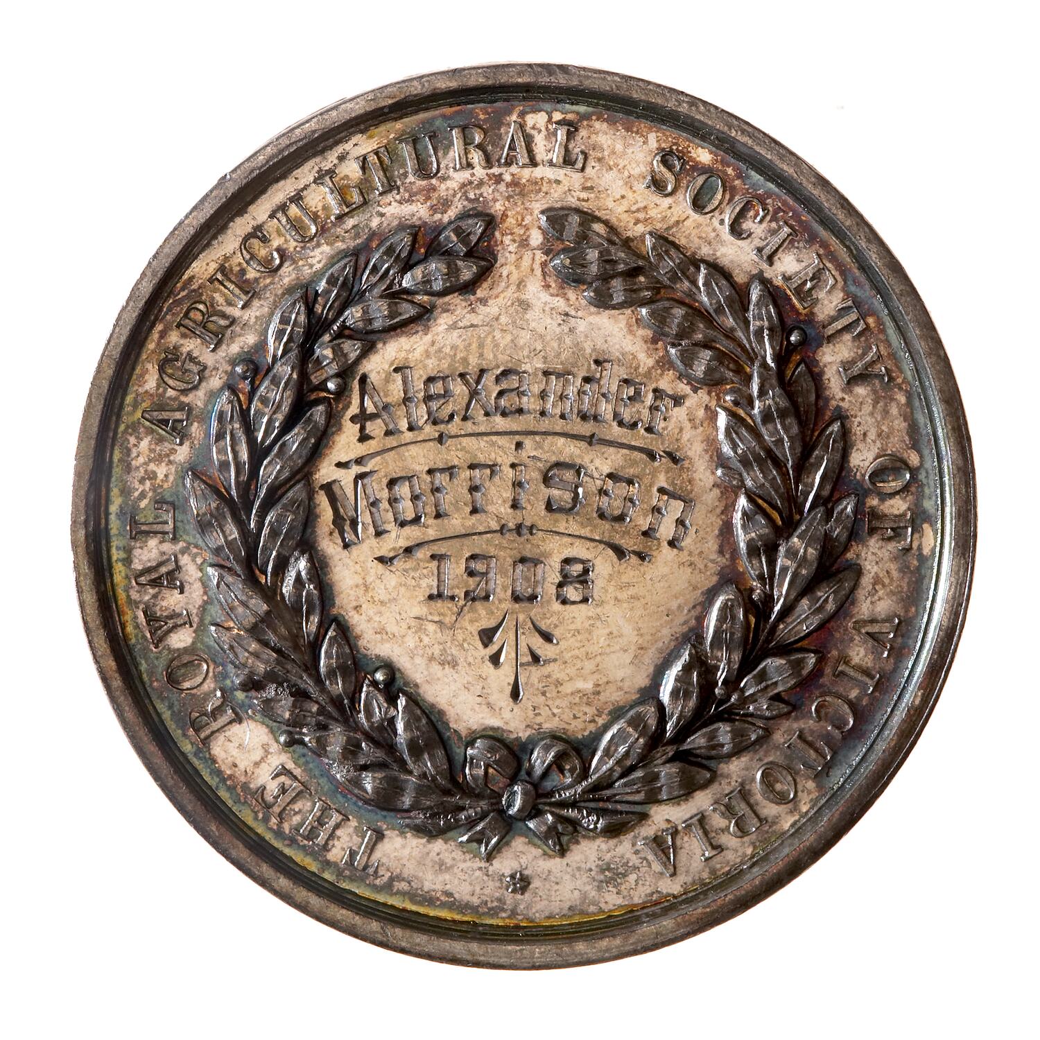 At centre inscribed within an olive wreath, Alexander Morrison / 1908; around, THE ROYAL AGRICULTURAL SOCIETY OF VICTORIA