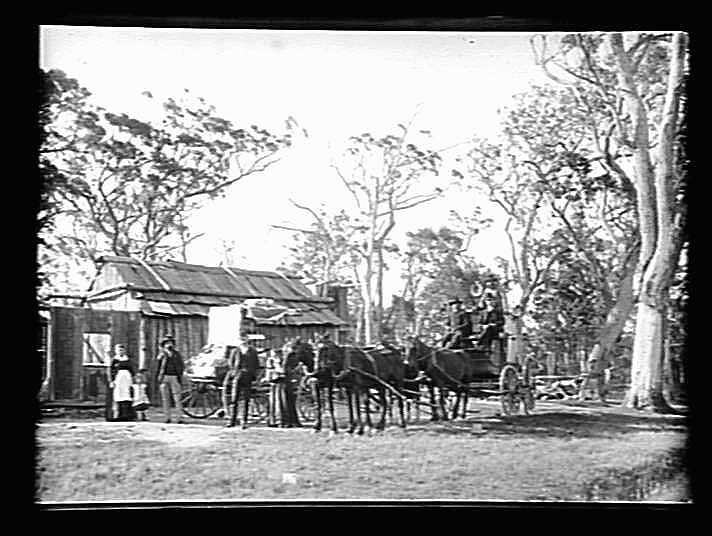 Stagecoach and buggy outside slab building; 8 people.