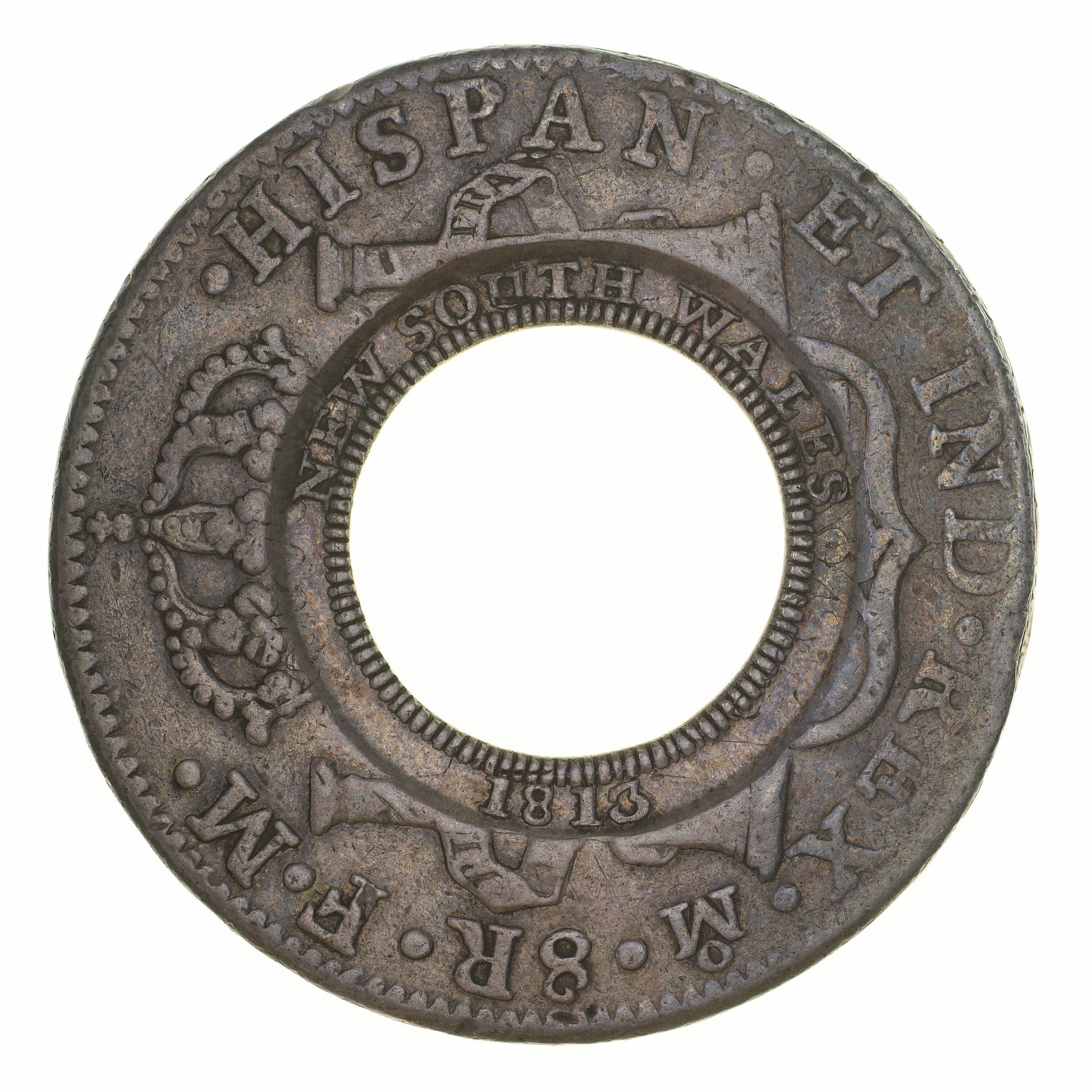 In 1813 Governor Lachlan Macquarie overcame an acute shortage of currency by arranging for the purchase of Spanish silver dollars, having the centres punched out and therein creating two new coins - the 'Holey Dollar' (valued at five shillings) and the 'Dump' (valued at one shilling and three pence).