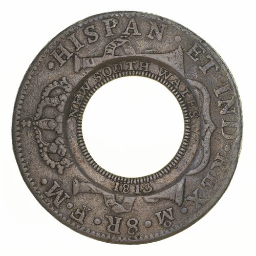 Overstruck around a circular hole cut from a Mexico Mint 8 Real coin, NEW SOUTH WALES 1813, around the rim of the original coin M (with a small o above) 8 R. F.M. HISPAN. ET IND. REX. This was the reverse of the host coin and featured a crowned shield of Spain supported by the pillars (mostly removed with the central dump).