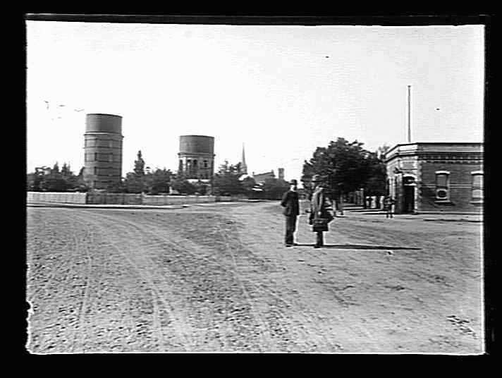 Two men standing in a street in Echuca. There are two water towers and a church steeple in the background. There is a brick building on the right which, judging from the flagpole, may be a government building. A man stands in front of the entrance.