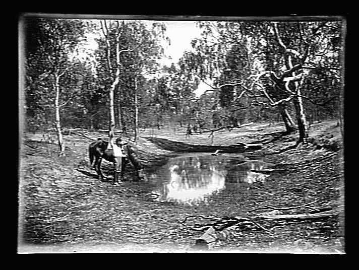 Man & horse drinking at a billabong.
