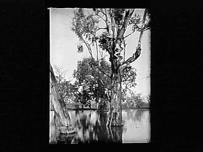 Naked man climbing a river red gum to reach a nest in the hollow.