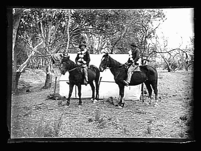 Two men on horseback, with emu eggs in sacks tied around rider 's necks.
