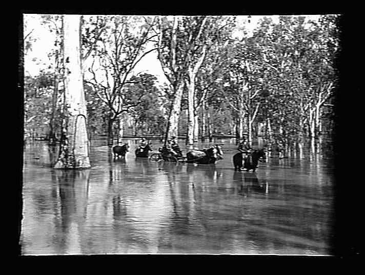 Horses, buggy in flood water, canoe tree on left.