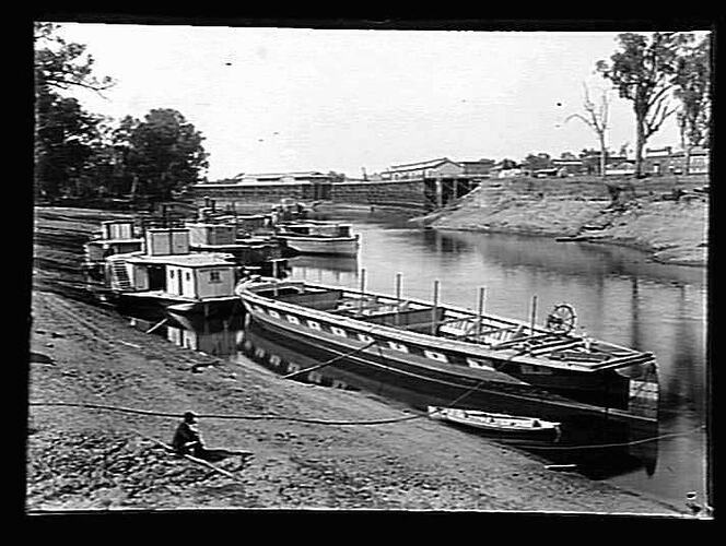 Inland port - Echuca. 6 paddle steamers and 1 barge paddle steamer 'Rothbury', paddle steamer 'Nile', paddle steamer 'Pride of the Murray', barge 'Kyuna'.