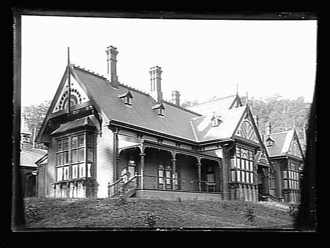 'Invermay' a large wooden house with shingled walls and roof. There are dormer windows in the roof, stained glass windows and an elaborate treatment of the gable ends. A man is standing at the top of the steps, trees are visible behind the house.