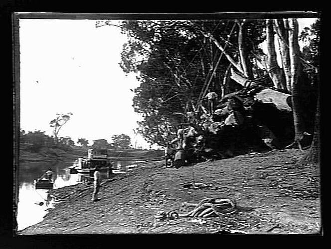 'Snagging' winching logs into piles on riverbank using paddle steamer PS 'Wardell' and ropes and pulleys Murray River.