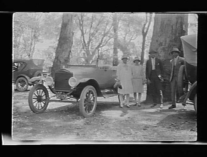 Two men and two women standing next to a Model T Ford car. Surrounded by other cars.