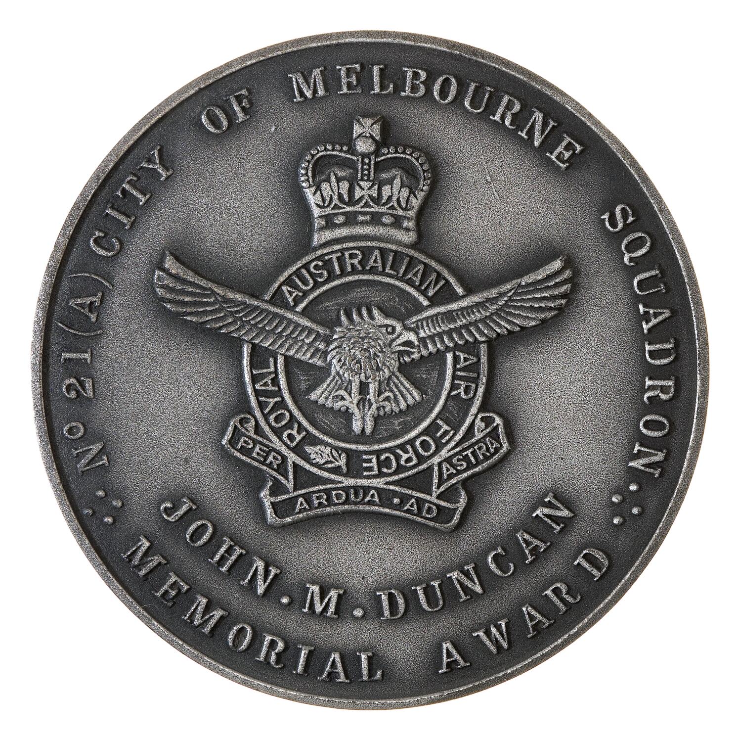 Air Force emblem; around above, No.21(A) CITY OF MELBOURNE SQUADRON below, JOHN.M.DUNCAN / MEMORIAL AWARD