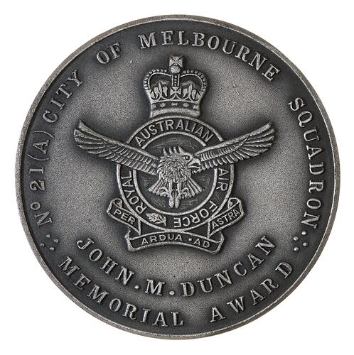 Plain (edge) Air Force emblem; around above, No.21(A) CITY OF MELBOURNE SQUADRON below, JOHN.M.DUNCAN / MEMORIAL AWARD (obverse) Winged powder horn; above "FOR OUTSTANDING CONTRIBUTION / TO THE SERVICE & SUUADRON"; below a plaque (uninscribed)(reverse)