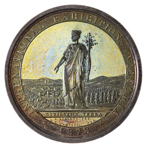 Female representing Colony of Victoria standing three quarters left before rural and industrial scene; around, INTERNATIONAL EXHIBITION VICTORIA * 1873 *; in exergue, DITISSIMA TERRA / J.HOGARTH FEC. / O.R. CAMPBELL DES.