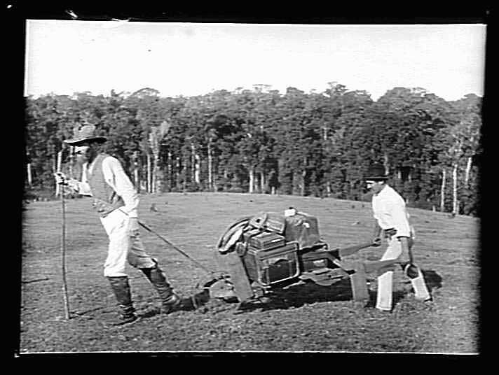 Two men transporting possessions on a wheelbarrow, fish creel on top one man is pulling the wheel barrow by a rope around his chest while the other pushes.