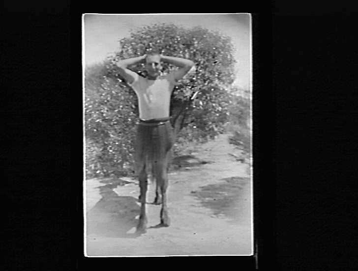 Trick photography to make a boy look like a centaur.