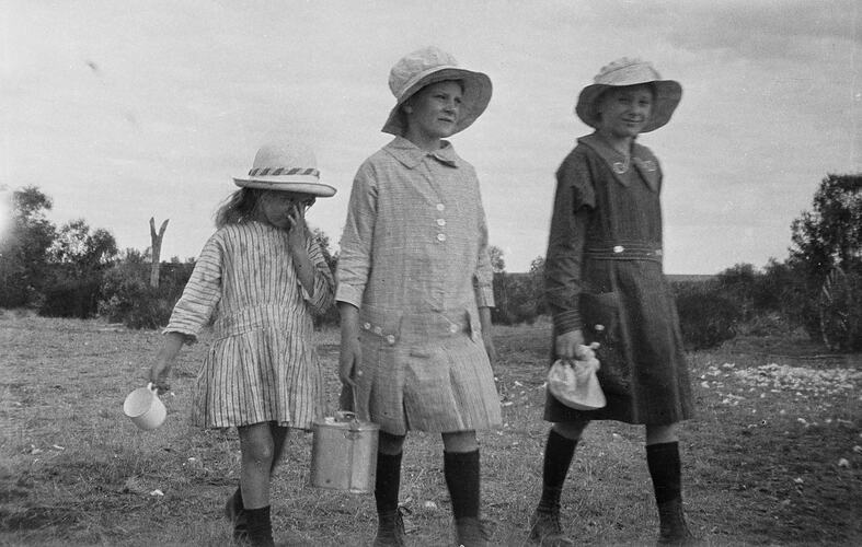 Black and white photographic negative of the Bomball children taking out 'the lunch' on the farm in Bimbourie, near Nandaly, Victoria. Photograph by William (Bill) Boyd. Acoording to Boyd in his oral history interviews, lunch was known as afternoon tea.