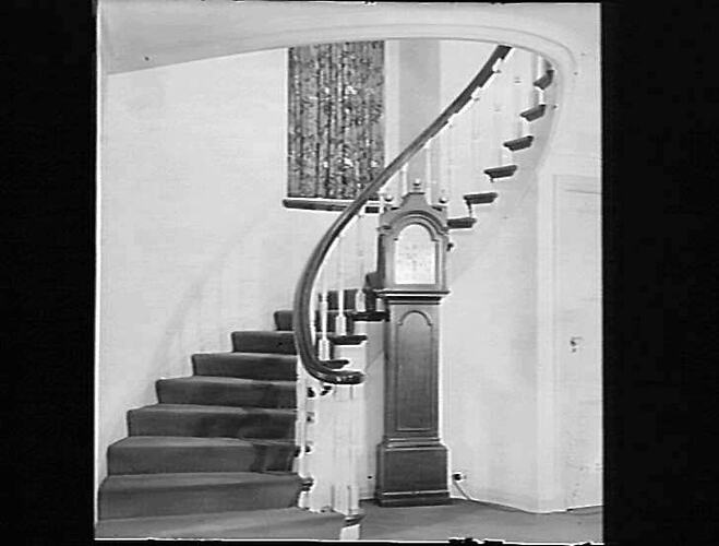 Staircase with grandfather clock.