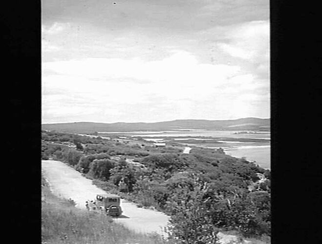 View of coast, road with car.