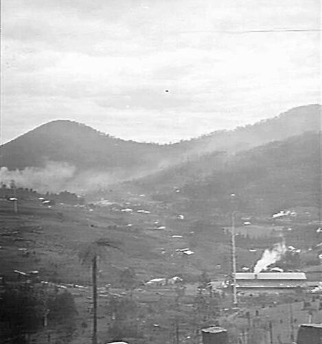 View from the southern slopes of Mount Victoria, overlooking the Enterprise Sawmill, towards the township of Warburton in the background. White smoke is billowing from a chimney at the sawmill. A large plume of smoke or fog/mist hangs over the hillside and township in the background, In the foreground are the stumps of several former large trees on the hillslope above the mill, and a single tall tree fern, while down the gully closer to the mill is the bleached white trunk of a tall dead eucalypt tree left standing when the forest was cleared. Behind the mill in the right middle ground is a cleared patch of grass used as the Warburton Football Ground, situated within a bend of the Yarra River.