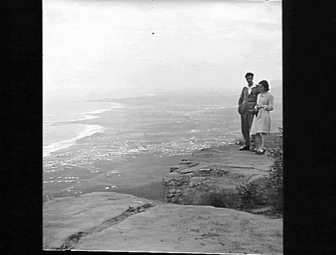 Couple standing on rocky lookout.