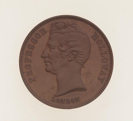 Head of Professor Holloway facing left with MOORE (the maker's name) in relief on neck truncation; around, PROFESSOR HOLLOWAY; below, LONDON.