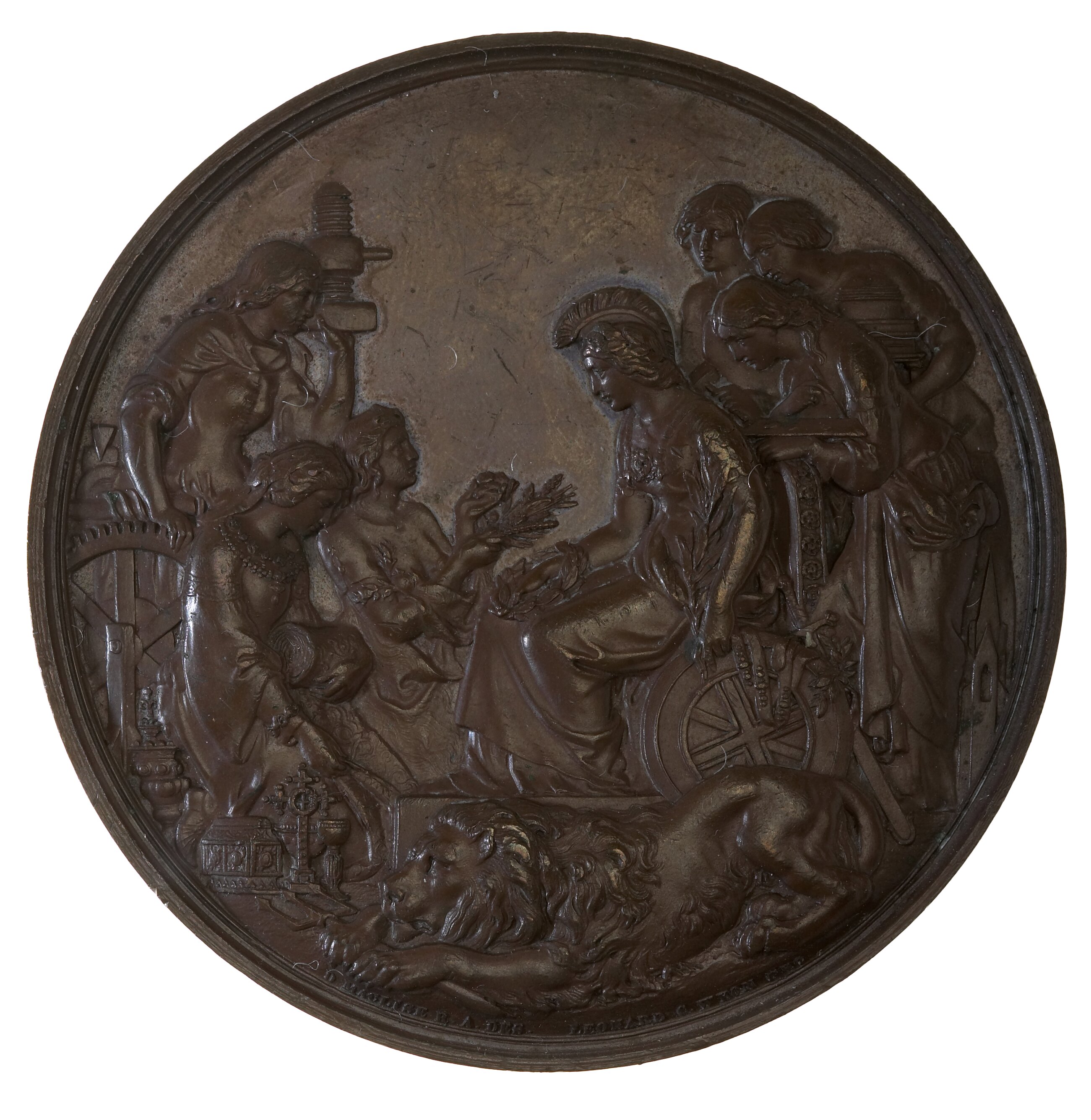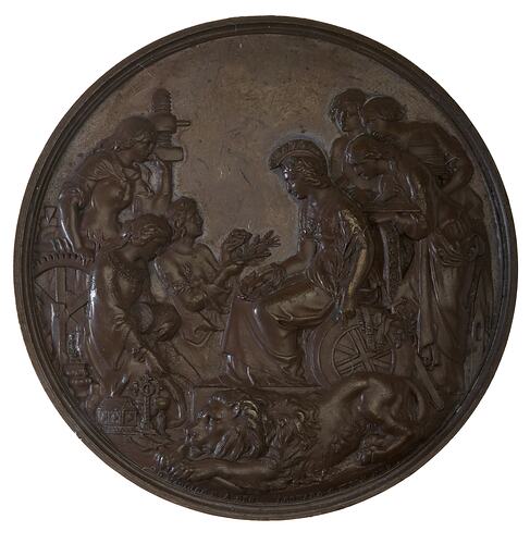 Obverse: Britannia seated on a raised dais beside a crouching lion surrounded by six women representing Industry, Agriculture and The Arts,and inscription. Reverse: Inscription within a wreath of oak.