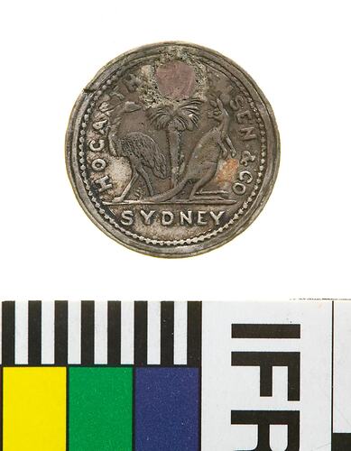 A round silver token (16 mm dia) featuring the name and partial address of the issuer: Hogarth, Erichsen and Co., Sydney around a kangaroo at right and emu at left standing either side of a small grass-tree. The kangaroo and emu standing on straight exergue line with the word SYDNEY in a straight line below. The reverse features the denomination "3" , 7 mm tall, within an oak wreath and breaking the date, 18 58. This token is holed and plugged through the top of the grass-tree.