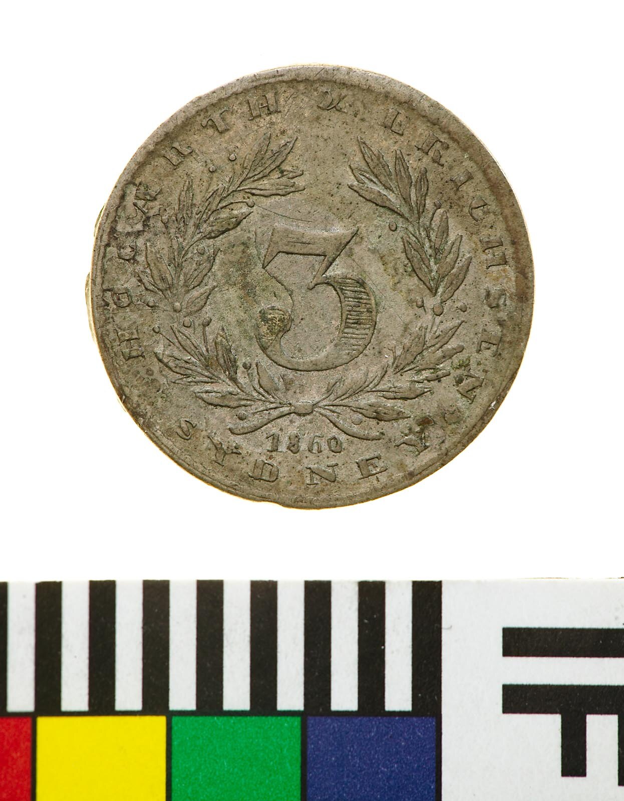 A round silver token (16 mm dia) featuring the name and partial address of the issuer: Hogarth, Erichsen and Co., Sydney around an olive wreath within which the denominational numeral '3' and below which the date, 1860 The reverse features a kangaroo, on left, and emu, on right standing either side of a grass-tree