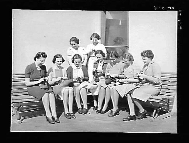 Typists knitting for red cross.