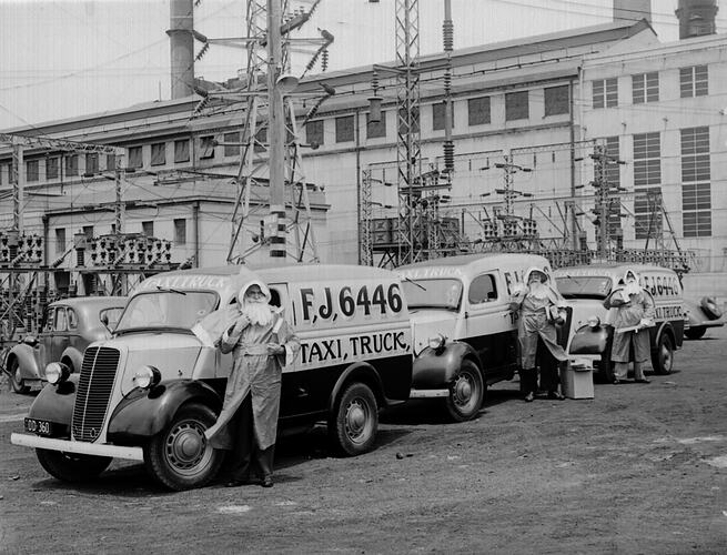 Newport Power Station - Christmas - Santas standing by taxis.