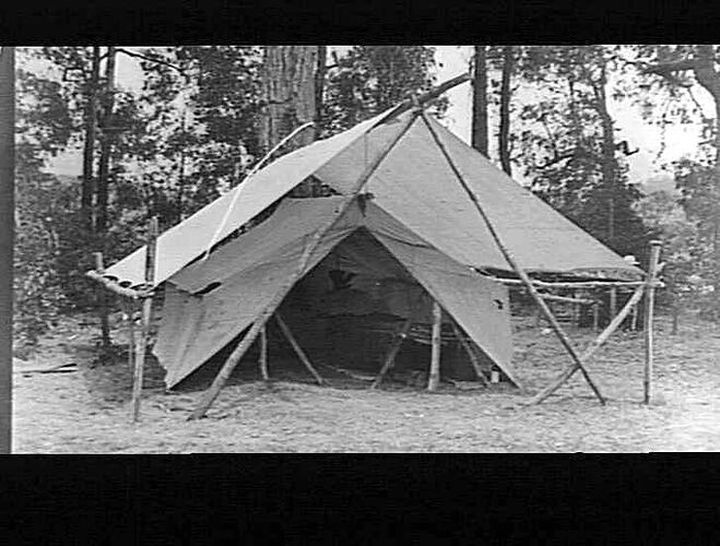 Camping tent seated person partially concealed by tent in background also see coll. No.20.