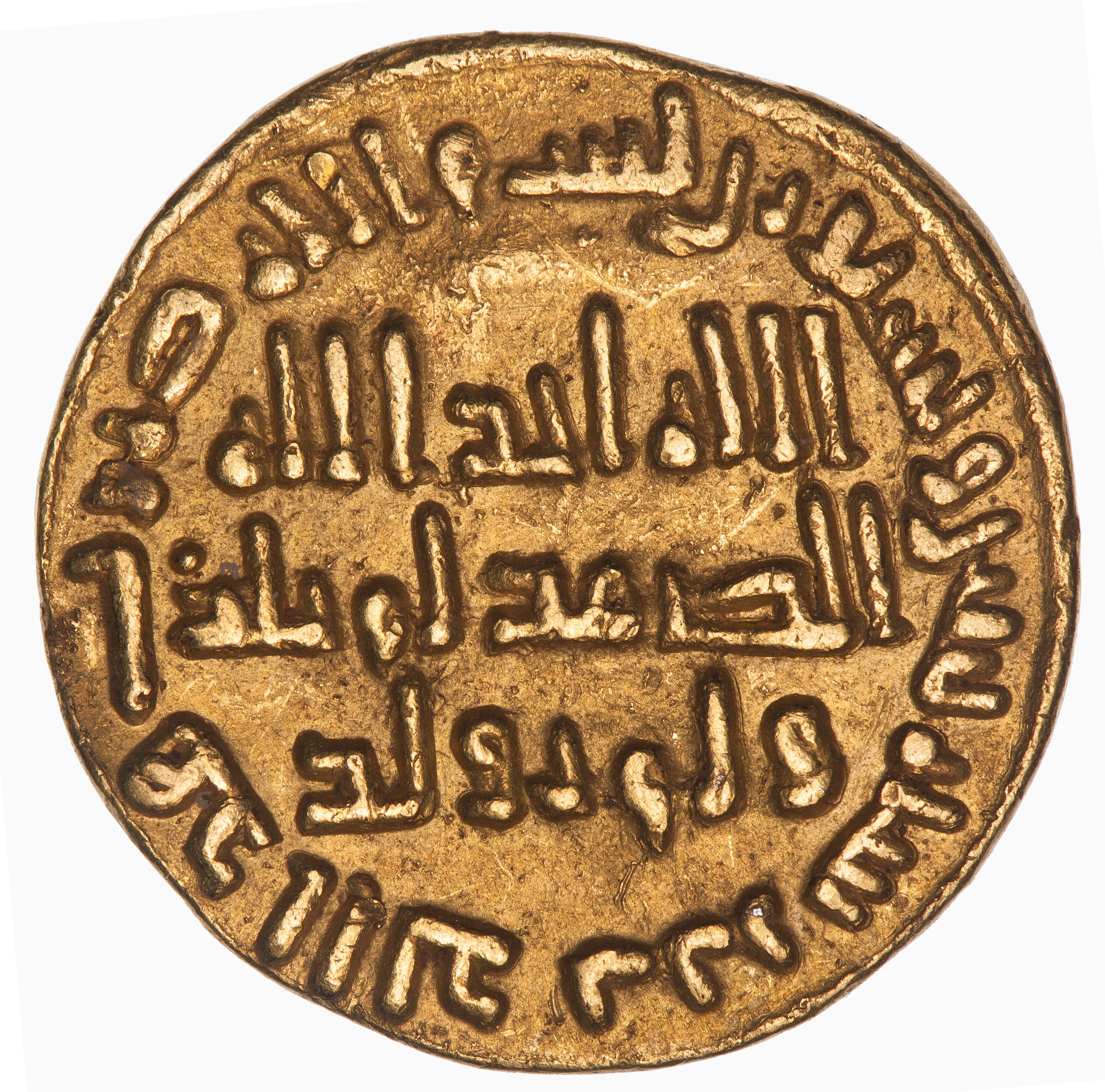 Dinar coin issued by the Umayyad Caliph al Walid I (705-715 AD). Struck at the Damascus mint (probable) in the year 92 AH (711-712 AD). The coinage reform which led to the issue of this coin began in 77 AH (696-697 AD) under the Umayyad Caliph 'Abd al-Malik. It removed all symbolism associated with Byzantine or Sassanian rule. Instead a purely inscriptional coin-type, giving in Arabic ( script and language) the Muslim confession of faith, and various Qur'anic verses were employed. On gold coins the date is of production is provided but not the name of the mint, it is believed that Damascus was the sole gold mint.