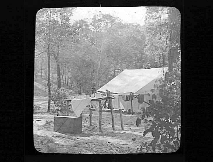 Bushes, Camp Sites, Clothes Lines, Clothing, Crates, Crockery, Tables, Tents, Trees, Lantern Slides