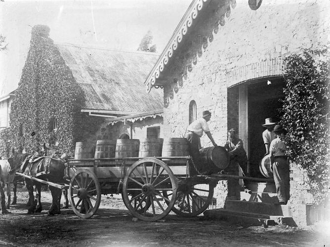 Barrels being loaded onto a wagon at St Hubert Winery.