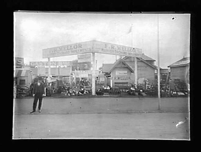 Display of Harvey farm implements F.R. Mellor, agent for Harvey. - negative out of focus -.