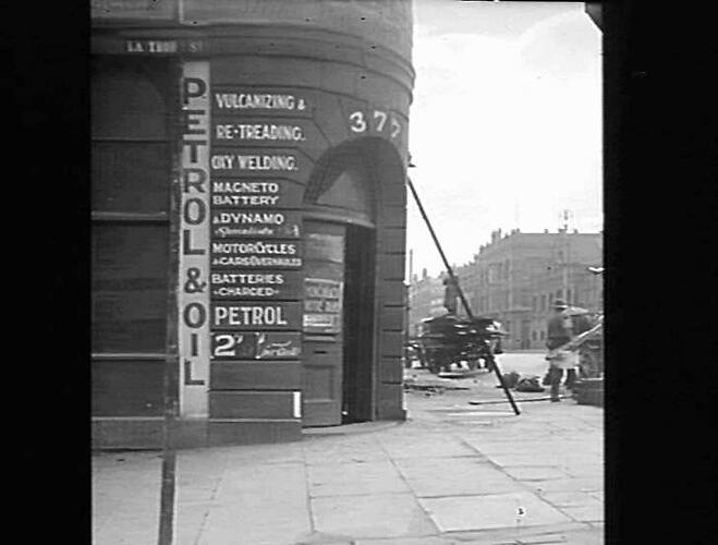 Building no.377 on the corner of La Trobe Street with advertisements for petrol and oil.