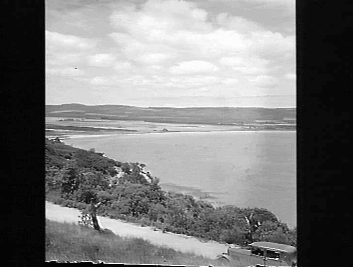 View of coast, road with car.